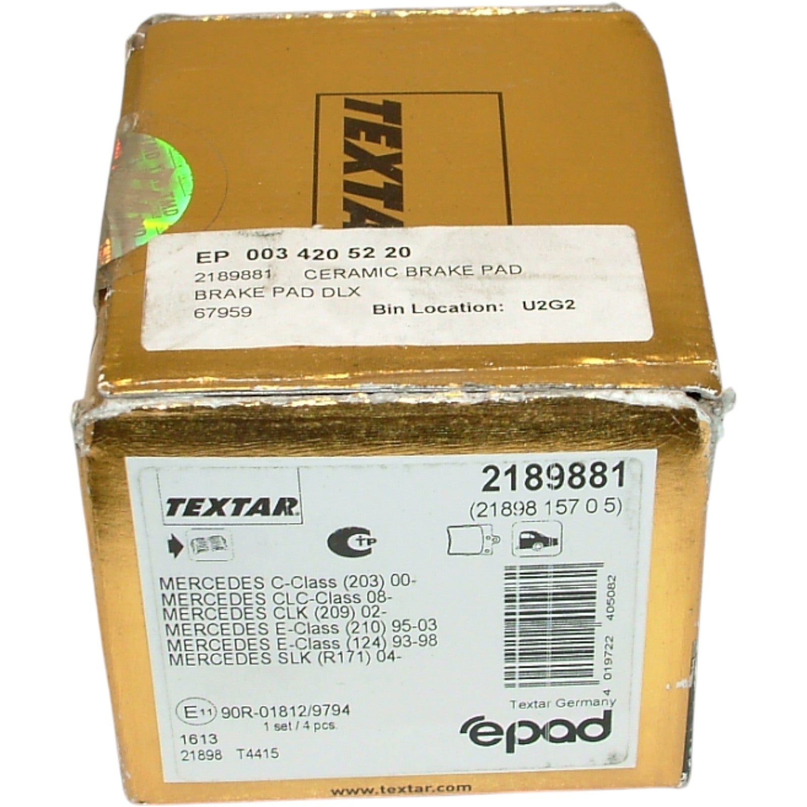 Rear Brake Pad Set for Select 1998 - 2001 Mercedes C, CLK, E and SLK, Textar Ceramic "ePad" Friction Materials Compound, 003 420 52 20 41